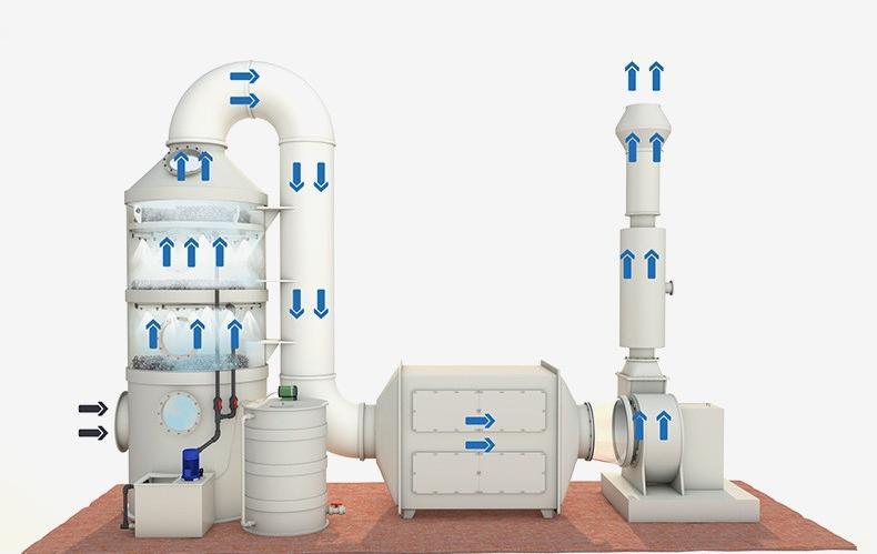 由于造紙廠生產(chǎn)工藝的特性在所排出的廢氣中會產(chǎn)生出惡臭、黏附、高溫,高濕、粉塵,此種情況下需要在活性炭吸附設(shè)備前設(shè)置水噴淋洗滌塔進(jìn)行降溫和去粉塵,將粗效過濾作為預(yù)處理設(shè)備,從而確保由引風(fēng)機(jī)引入的廢氣中所含粉塵雜質(zhì)在進(jìn)入活性炭吸附設(shè)備時得到有效的攔截過濾。把通過初步預(yù)處理的廢氣輸入光解凈化設(shè)備后采用風(fēng)機(jī)送出,再通過排風(fēng)管道高空排放。