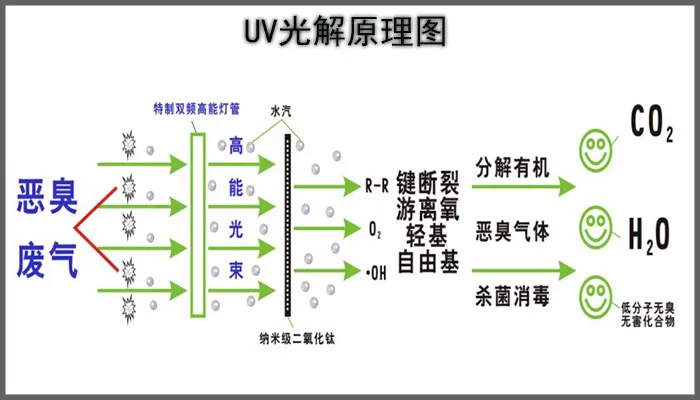 2、利用特制的高能UV紫外線光束照射惡臭氣體,裂解惡臭氣體的分子鍵,降解轉(zhuǎn)變?yōu)榈头肿踊瘜W(xué)物,如二氧化碳和水等物質(zhì)。