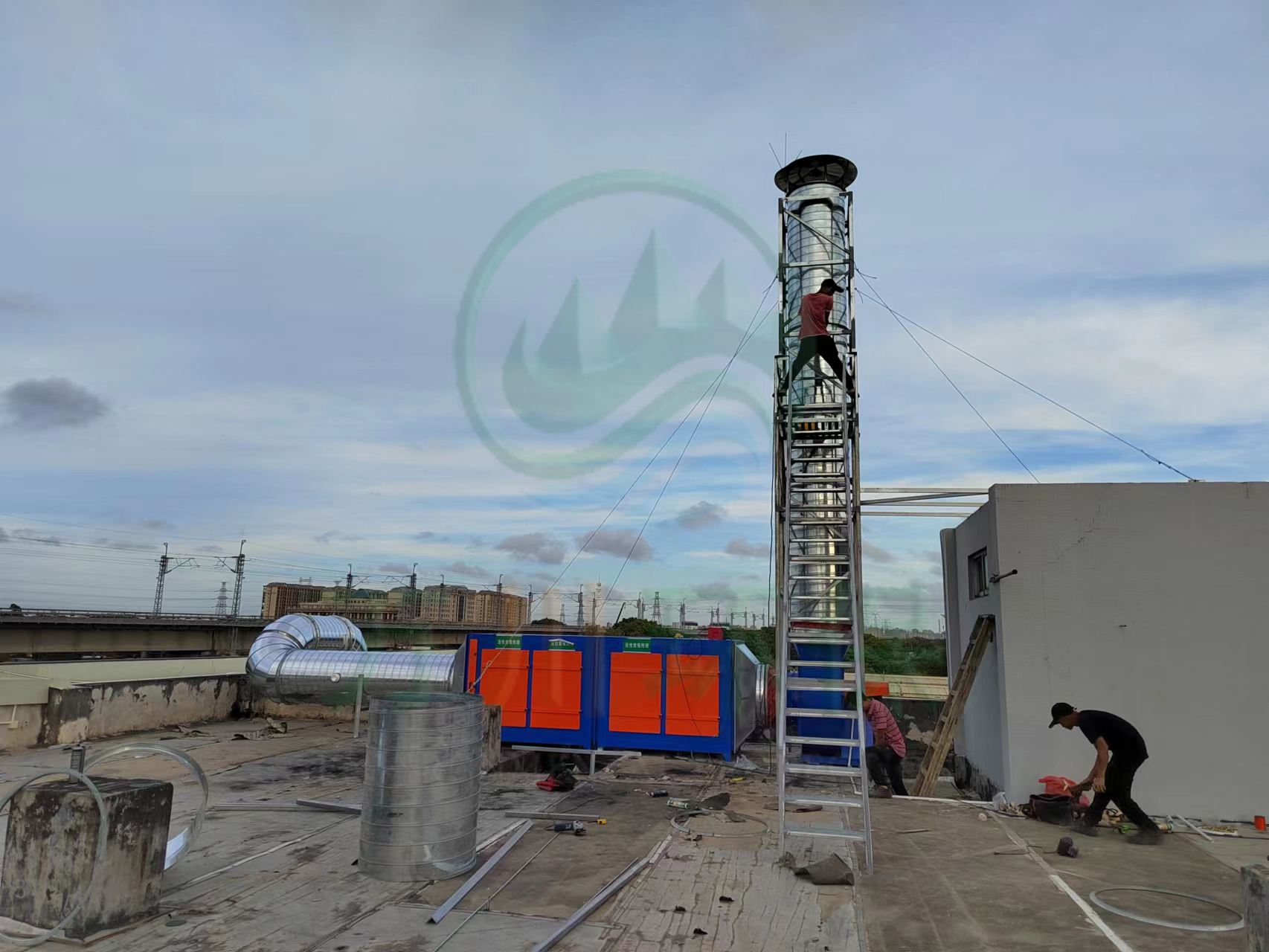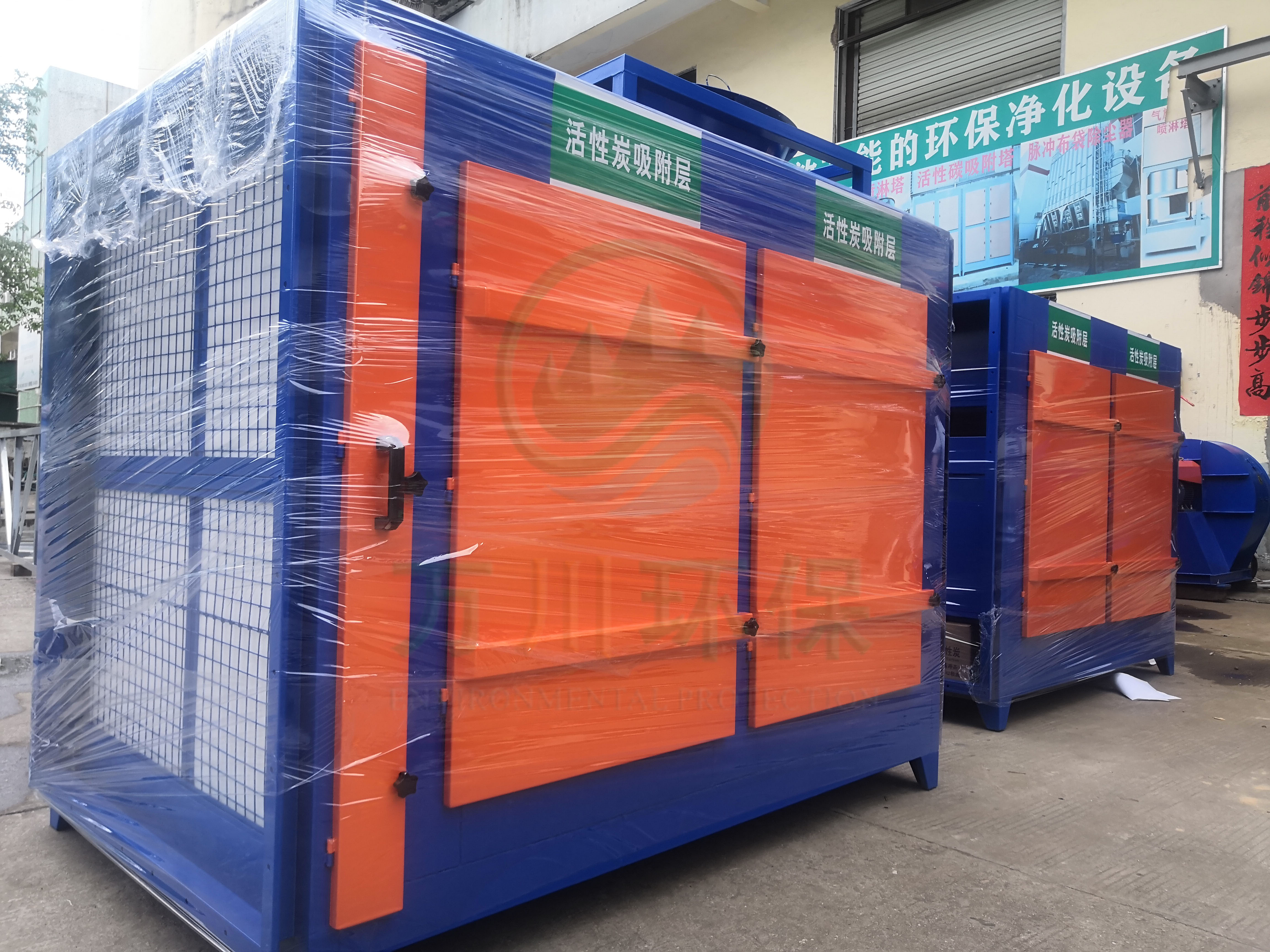 根據(jù)廢氣類型和場地需求我們采用兩級活性炭吸附法對其進行處理。配套兩臺1萬風(fēng)量的碳鋼材質(zhì)活性炭吸附塔與大功率離心風(fēng)機,自帶自動化控制系統(tǒng)。