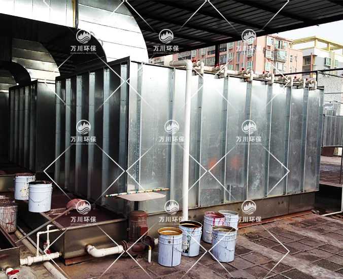 均勻安裝多層濕簾層和過濾層。水性過濾棉,不吸水,漆粉附著表面時,會隨水流受重力作用被洗滌至循環(huán)水池,不易堵。濕簾層經水洗后會在面上形成一層水膜,漆粉經過該層被水膜黏附,對降低氣體流速,加長廢氣在噴淋塔的洗滌時間有重要作用。廢氣經過除霧層(即氣水分離)后,再進行活性炭吸附塔吸附。該法具有處理效果高,運行穩(wěn)定優(yōu)點。