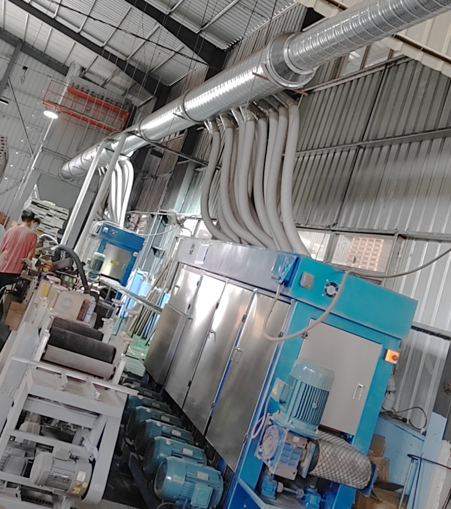 在木塑板生產(chǎn)的過程是要對其表面砂光、打磨處理,會產(chǎn)生大量的粉塵,萬川根據(jù)場地與粉塵類型設(shè)計了除塵方案與一配套木塑脈沖布袋除塵器。