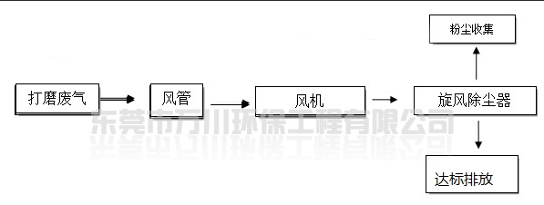 二樓的切削打磨屬于粉塵廢氣,打磨拋光時所產(chǎn)生的粉塵通過收集由引風機抽至車間外。本方案設(shè)計設(shè)粉塵廢氣處理系統(tǒng)二套,處理能力為15000m3/h,系統(tǒng)設(shè)于車間一樓。