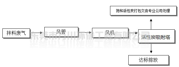 拌料固化產(chǎn)生的屬于揮發(fā)性的有機廢氣,通過車間內(nèi)合理布管,由引風機抽至車間外處理后排放,處理能力為18000m3/h,系統(tǒng)設(shè)于車間樓頂。