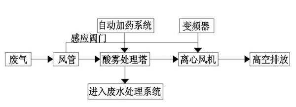 酸霧廢氣由風(fēng)管進入酸霧處理塔,自下而上穿過填料層;循環(huán)堿液吸收劑由塔頂通過螺旋噴嘴,形成的水霧勻地噴淋到填料層中,沿著填料層表面向下流動,進入循環(huán)水箱。由于上升氣流和下降霧化吸收劑(堿液)在填料中不斷接觸,上升氣體中流質(zhì)的濃度越來越低。使其酸霧得到凈化,達標排放。