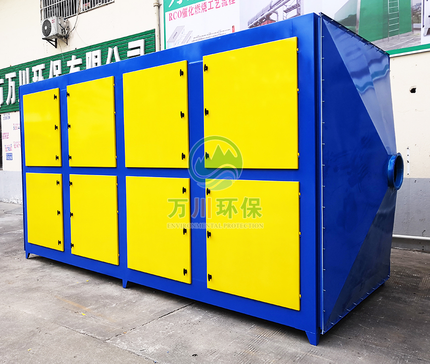橡膠廢氣從管道進入到設備內,穿過第一層噴淋層,用水沖洗廢氣,再進入到第二、第三層填料層,去除水溶性的粉塵和廢氣,最后進入到活性炭吸附層,利用活性炭的吸附力,吸附有機廢氣,達到凈化的效果。