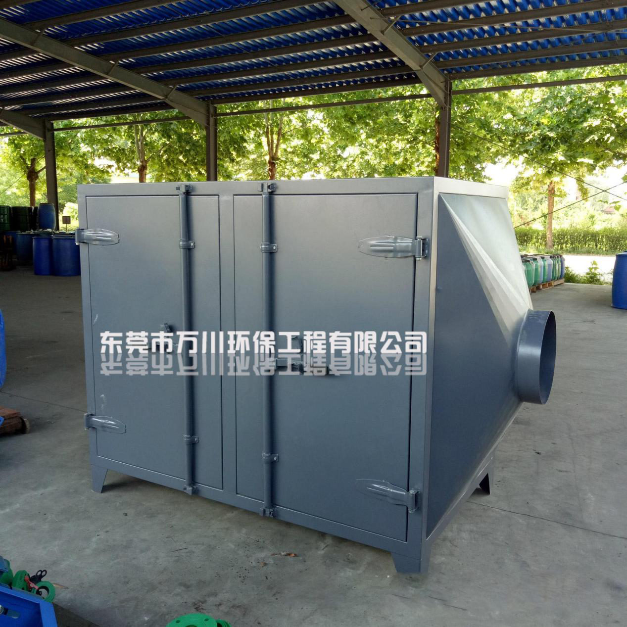 橡膠廢氣從管道進(jìn)入到設(shè)備內(nèi),穿過第一層噴淋層,用水沖洗廢氣,再進(jìn)入到第二、第三層填料層,去除水溶性的粉塵和廢氣,最后進(jìn)入到活性炭吸附層,利用活性炭的吸附力,吸附有機廢氣,達(dá)到凈化的效果。
